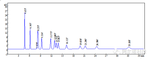 用0.45um的有機濾膜過濾溶液,取1.5mL濾液于樣品瓶中,備用。上樣于液相色譜儀, 根據(jù)標準曲線計算醛酮含量. 阿爾塔14種醛酮腙HPLC 色譜柱的類型: Agela Venusil MP 4.6*150mm 色譜條件: MeCN:H2O:60:40, 1mL/min 色譜類型: 固定波長色譜, 254 nm 出峰順序:1. 甲醛-DNPH,2. 乙醛-DNPH,3. 丙酮-DNPH +丙烯醛-DNPH,4. 丙醛-DNPH,5. 丁烯醛-DNPH,6. 丁酮-DNPH,7. 丁醛-DNPH,8. 甲基丙烯醛-DNPH,9. 苯甲醛-DNPH,10. 戊醛-DNPH,11. 間甲基苯甲醛-DNPH,12. 環(huán)己酮-DNPH,13. 己醛-DNPH 如需訂購或者獲取更多產(chǎn)品信息,請聯(lián)系我們: 電話:022-65378550 QQ:2850791070/2850791074 Email:sales@altascientific.com