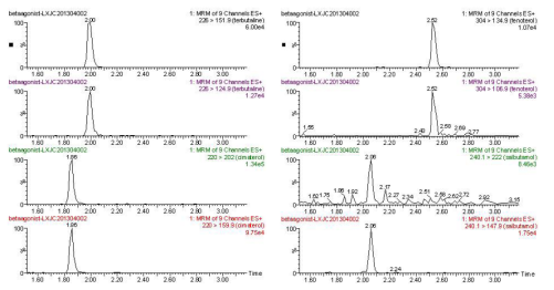 9 種β- 受體激動劑特征離子質(zhì)量色譜圖:
