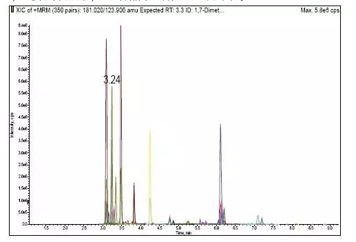 圖1. 176種濃度為5 ng/mL的PPCPs標準品色譜圖。