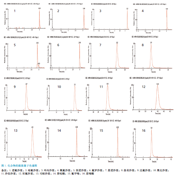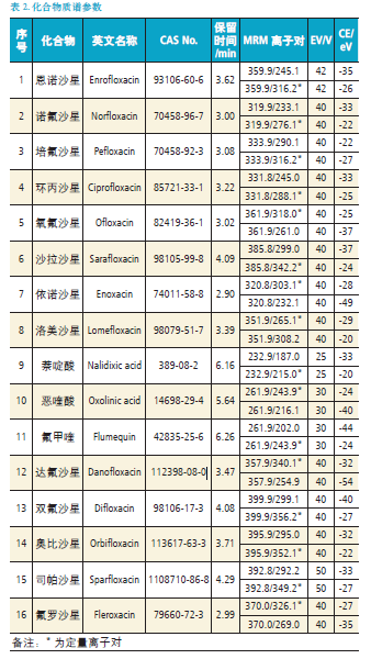 以下參數(shù)以PerkinElmerQSight 200 系列為例,喹諾酮類化合物質(zhì)譜參數(shù)見表2。