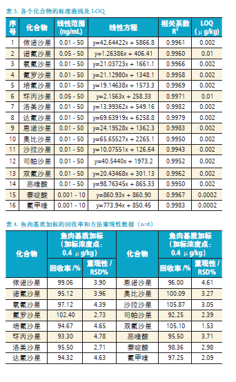 其余喹諾酮目標(biāo)化合物的標(biāo)準(zhǔn)曲線在0.01-50 ng/mL,依次為0.01,0.02,0.05,0.1,0.2,0.5,1.0,2.0,5.0,10.0,20.0,50.0 ng/mL。其中,諾氟沙星和環(huán)丙沙星為0.05-50 ng/mL,萘啶酸和氟甲喹為0.001-10 ng/mL。標(biāo)準(zhǔn)曲線范圍內(nèi)具有良好的線性(R2> 0.994);采用魚肉基質(zhì)作為加標(biāo)樣品,平行6 個樣品測試方法的回收率和方法重現(xiàn)性,詳細(xì)結(jié)果請見表4。從表4 可以看到,在加標(biāo)濃度為2 ng/mL 下,回收率為92.25-105.87 %,方法重現(xiàn)性為1.53-4.78%。最低定量限為0.0002-0.01μg/kg,完全符合殘留檢測要求。