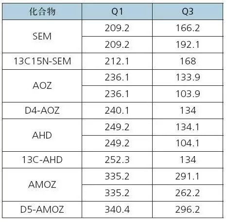 檢測物及其同位素內(nèi)標離子對信息如下: