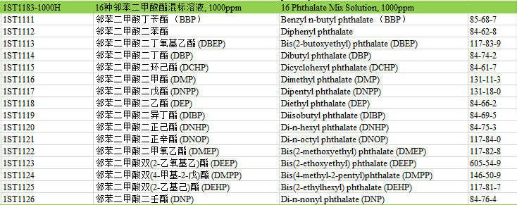 16種鄰苯二甲酸酯混合標準品(純度99%):正己烷溶解;