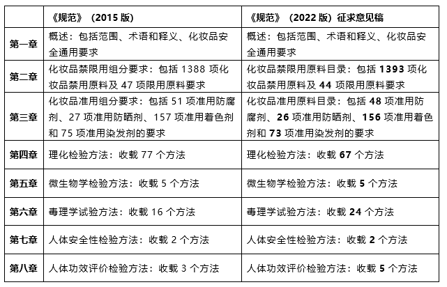 為貫徹落實(shí)《化妝品監(jiān)督管理?xiàng)l例》的要求,進(jìn)一步完善化妝品安全技術(shù)法規(guī)體系,中國食品藥品檢定研究院于2022年3月31日,發(fā)布“中檢院關(guān)于公開征求《化妝品安全技術(shù)規(guī)范》修訂意見的通知”(以下簡稱為“通知”)。此次“通知”附件中 “《化妝品安全技術(shù)規(guī)范(2022年版)》征求意見稿”的構(gòu)架及主要內(nèi)容,與現(xiàn)行的《化妝品安全技術(shù)規(guī)范(2015年版)》對(duì)比如下